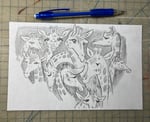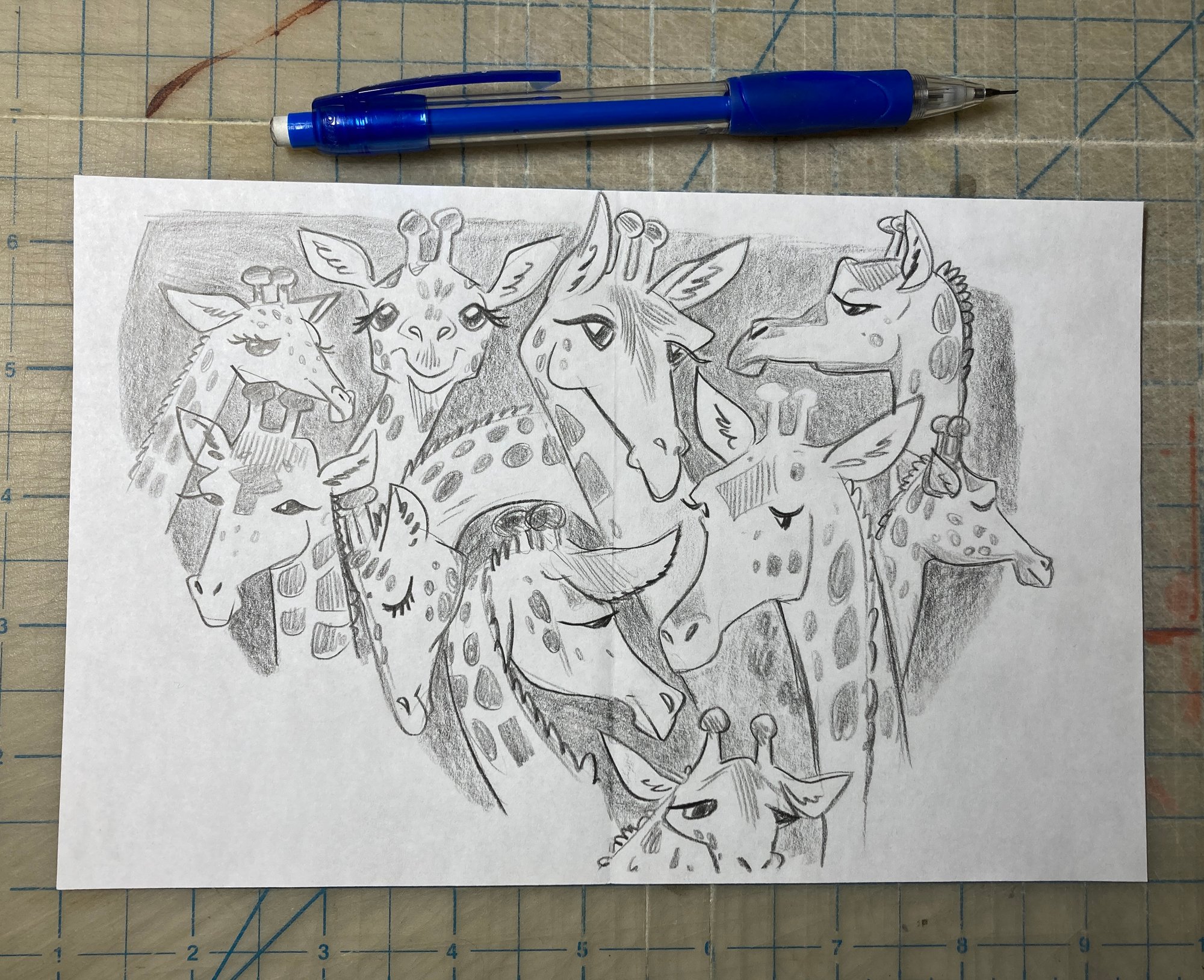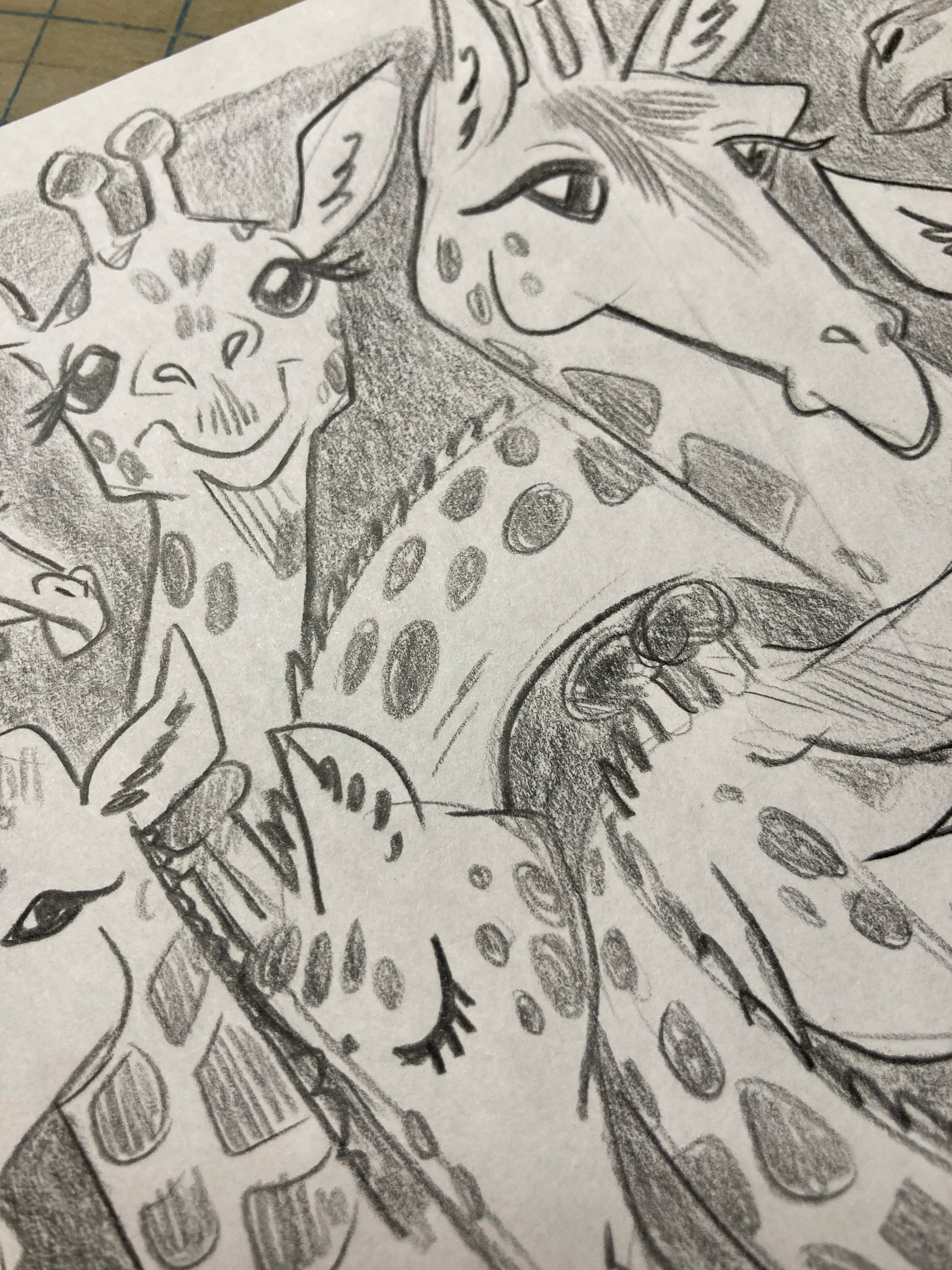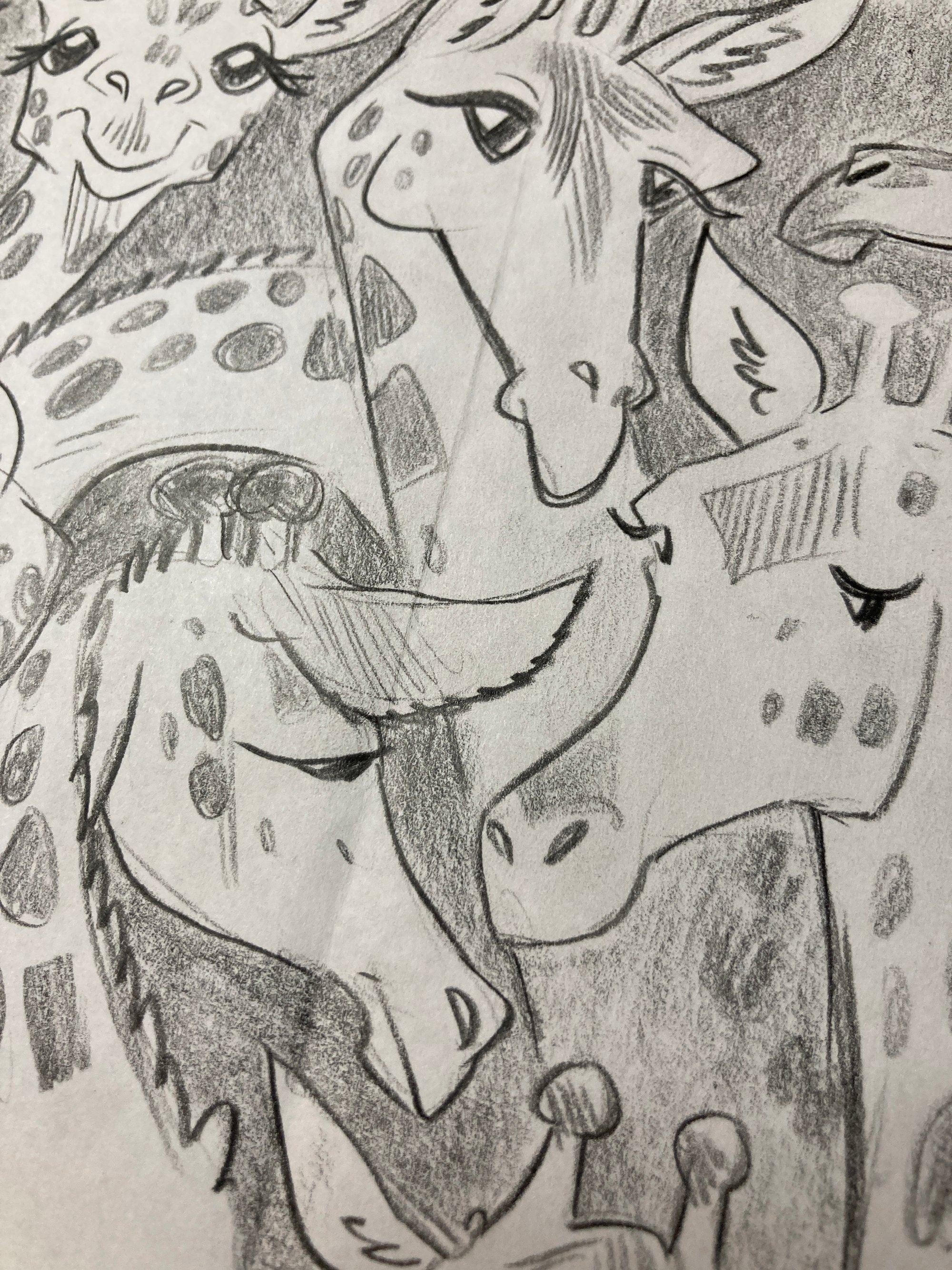Pencil doodle of several giraffes drawn on the back of very scrappy scrap paper (please expect to see, like, a doctor's receipt or a life insurance sales pitch on the back; may be seen a bit from the front as well, but it's minimal!)
